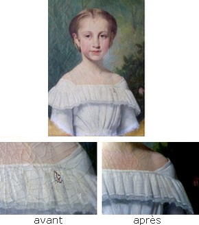 Les pièces servent à « réparer » ces déchirures, elles sont constituées de morceaux de tissus carrés ou rectangulaires qui sont collés derrière une zone accidentée d'un support textile. Elles stabilisent cette zone et facilitent la restauration ultérieure.“ Portrait de jeune fille ”