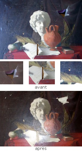 - Pose de mastic, réintégration picturale et vernis final