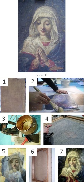 Elle est pratiquée sur des tableaux anciens qui sont conservés dans une atmosphère non humide. On rentoile un tableau pour plusieurs raisons : toile affaiblie, déformée, déchirée et trouée de manière importante, manque d'adhérence de la couche picturale à son support.“ Vierge en prière ”
